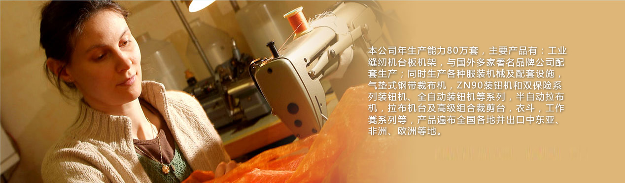 工業縫紉機臺板機架,與國外多家著名品牌公司配套生產;同時生產各種服裝機械及配套設施,氣墊式鋼帶裁布機,ZN90裝鈕機和雙保險系列裝鈕機、全自動裝鈕機等系列,半自動拉布機,拉布機臺及高級組合裁剪臺,衣斗,工作凳系列等,產品遍布全國各地并出口中東亞、非洲、歐洲等地。